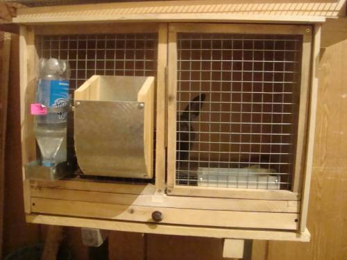 Материал - фанера. В комплекте с клеткой кормушка бункерная на 3 л.(оцинковка) и поилка под бутылку (оцинковка). Выдвижной поддон.